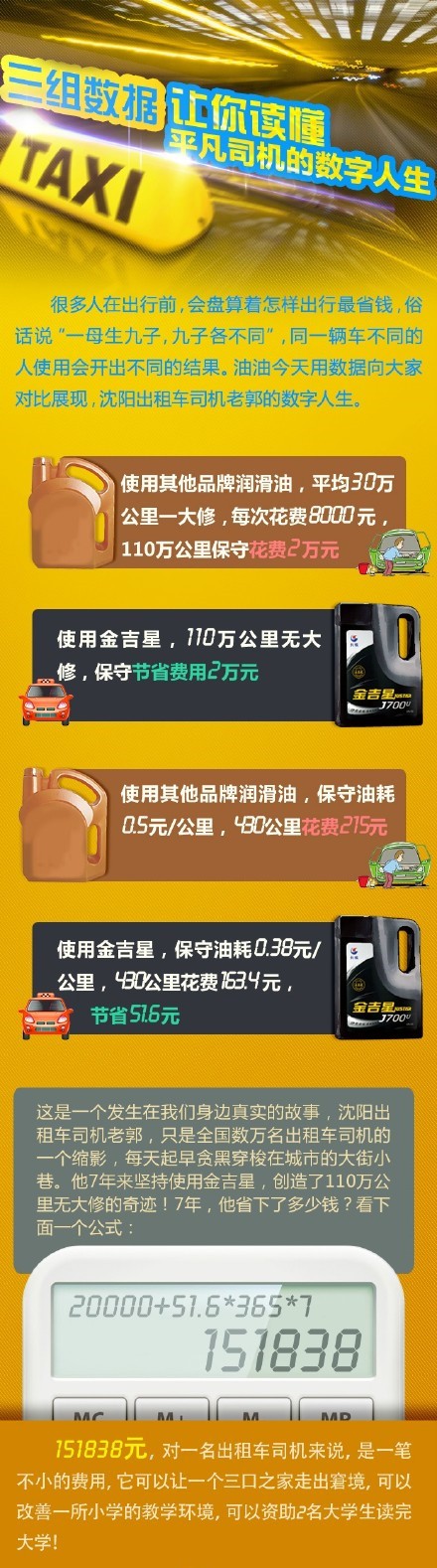他是一位平凡的出租車司機,7年來風雨無阻堅守在馬路上,給無數(shù)人送去了溫馨;他7年行駛了110萬公里,創(chuàng)造了無大修的奇跡。他就是沈陽出租車司機老郭,7年來堅持使用金吉星,省下了至少15萬的費用,油油用數(shù)據(jù)讓你讀懂老郭的數(shù)字人生。